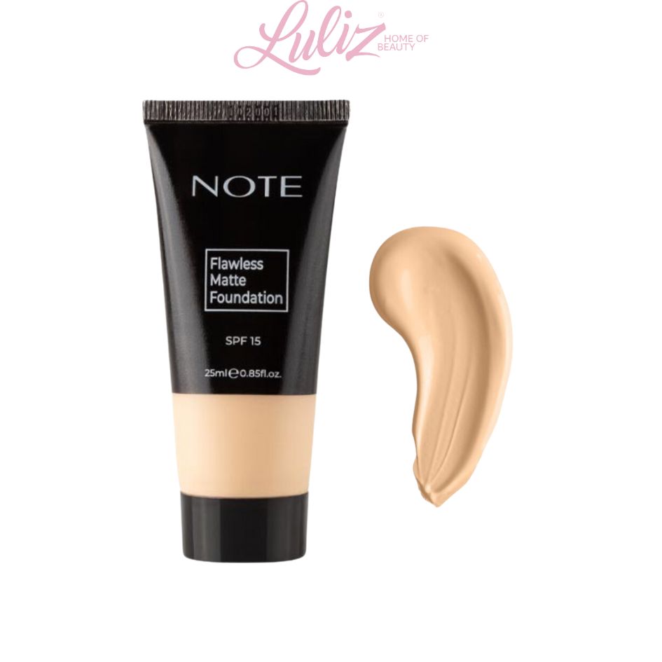 Note flawless matte foundation Long lasting matte effect and a flawless, shine-free complexion. With SPF 15 protection. Breathable formula. Controls shine, ensures a comfortable application leaving skin feeling smooth and velvety. Ideal for combination prone to oily skin. Texture: silky creamy texture Performance: provides medium buildable to high coverage Skin type: suitable for all skin types.