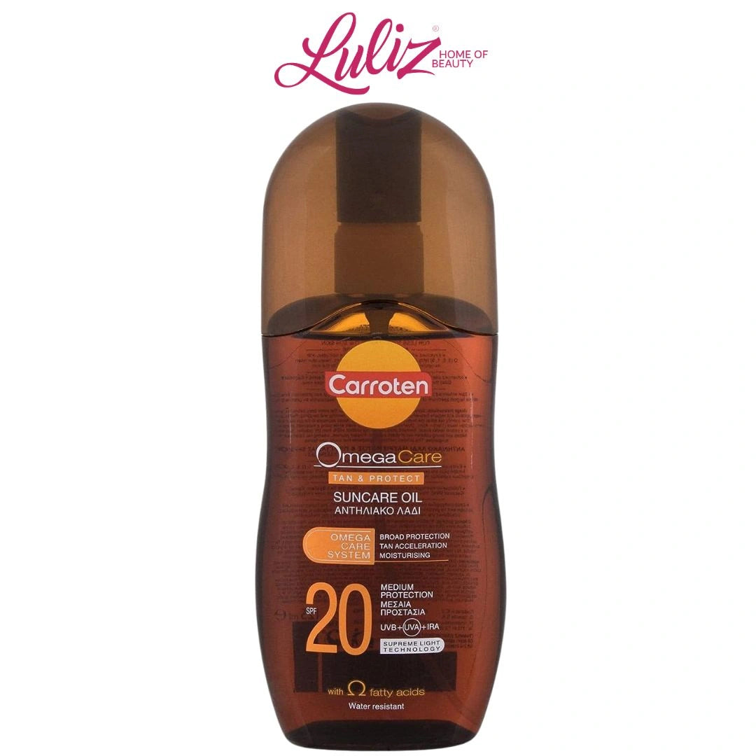 Carroten Suncare Oil Tan And Protect SPF 20+ - 125 Ml Omega Care Suncare Oil SPF20 is enriched with Omega Care complex (Ω 3,6,7,9 fatty acids + chrysanthemum extract) that helps skin retain its optimum moisture levels, while a blend of rich tanning oils, enhance the tanning process for a sun-kissed glowing skin